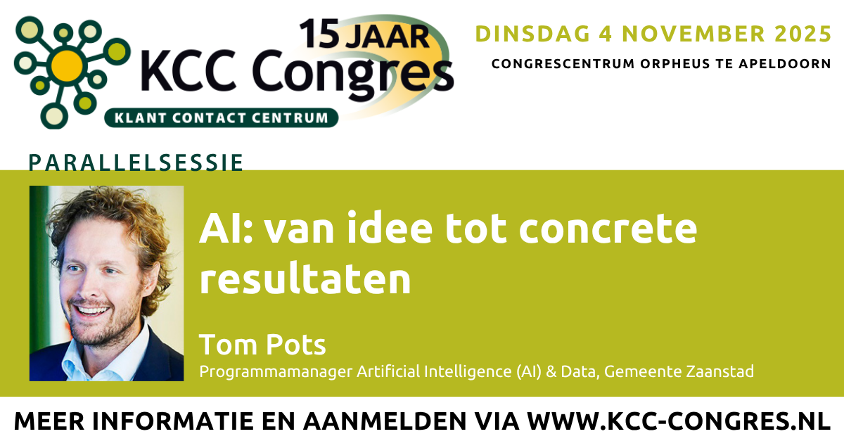 Tijdens de inspiratiesessie ‘AI: van idee tot concrete resultaten’ neemt Tom Pots (programmamanager AI & Data bij de gemeente Zaanstad en programmaleider Data en -AI-gedreven sturing in de publieke sector aan de Vrije Universiteit) je mee in de wereld van kunstmatige intelligentie, machine learning en algoritmen. Met concrete voorbeelden uit de dagelijkse praktijk laat hij zien hoe AI al verweven is in ons leven en werk. Bovendien ontdek je samen wat deze ontwikkelingen betekenen voor jouw werk, KCC en organisatie. En hoe je als organisatie actief vorm kunt geven aan deze veranderingen om kansen optimaal te benutten en uitdagingen het hoofd te bieden.