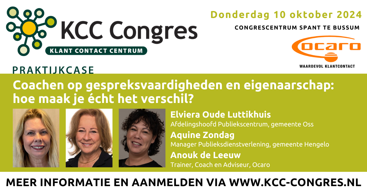 In een boeiende, interactieve sessie delen Elviera Oude Luttikhuis (Afdelingshoofd Publiekscentrum gemeente Oss), Aquine Zondag (manager Publieksdienstverlening gemeente Hengelo) en Anouk de Leeuw (trainer Ocaro) hun aanpak en ervaringen. Inzichten en praktische handvatten voor KCC-teamleiders met zowel meer als minder ervaring in het coachen op klantcontact.